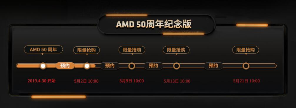 本次AMD“传奇50载 精彩再出发”50周年活动将从4月30日持续到5月22日,活动期间内在指定时间点用户们可以限时抢购AMD锐龙7 2700X 50周年纪念版处理器和AMD Radeon VII 50周年纪念版 7nm 游戏显卡,以及琳琅满目的DIY联盟套包,其中5月2日,5月9日,5月13日和5月21日为秒杀日,除了50周年纪念版的AMD CPU, 显卡以外,还有极品整机预约,请广大用户及时抢购和预约,不要错过!(此次活动详情请以AMD天猫、京东官网为准,具体活动前往官方网站了解更多)