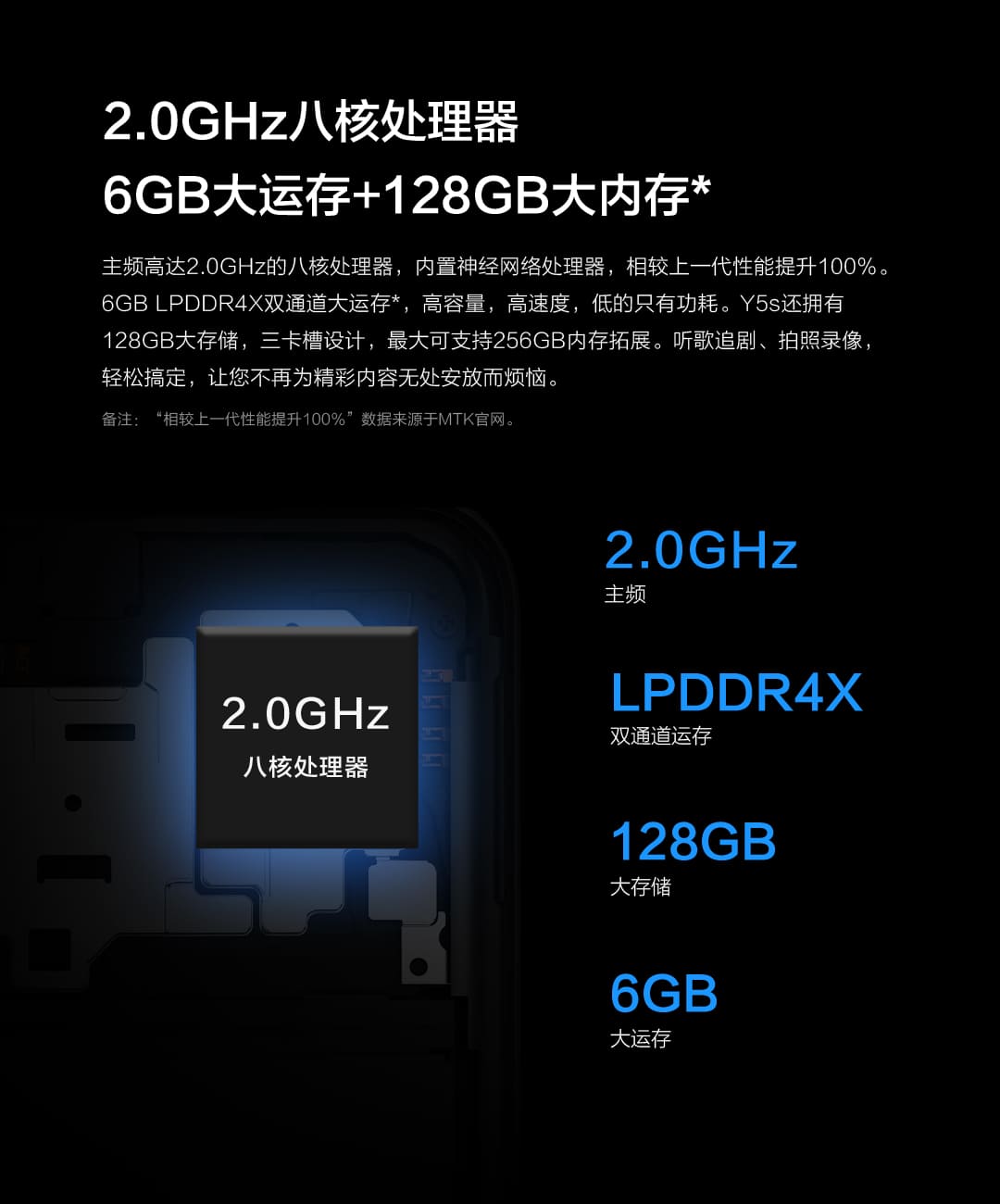 在超能续航的基础上,vivo Y5s还为手机的流畅运行打造了强劲的配置。vivo Y5s搭载了最高主频达2.0GHz的八核处理器,性能比上一代提升了100%;内置神经网络处理器,能够为AI处理提供性能保障。