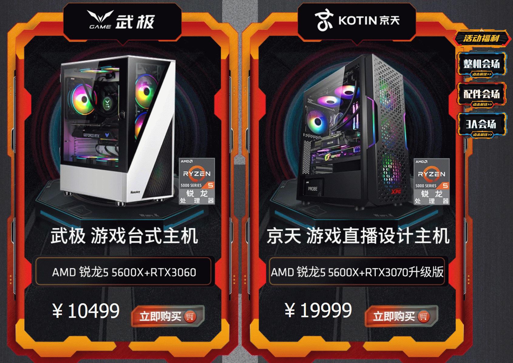 本次活动还准备了锐龙5000系列处理器为核心的整机产品,来自京天、武极、攀升、宁美、名龙堂和讯景的多款整机一定可以满足广大DIY玩家的各种使用需求。当然最难买到的显卡此次也有少量库存上架等待玩家们抢购。