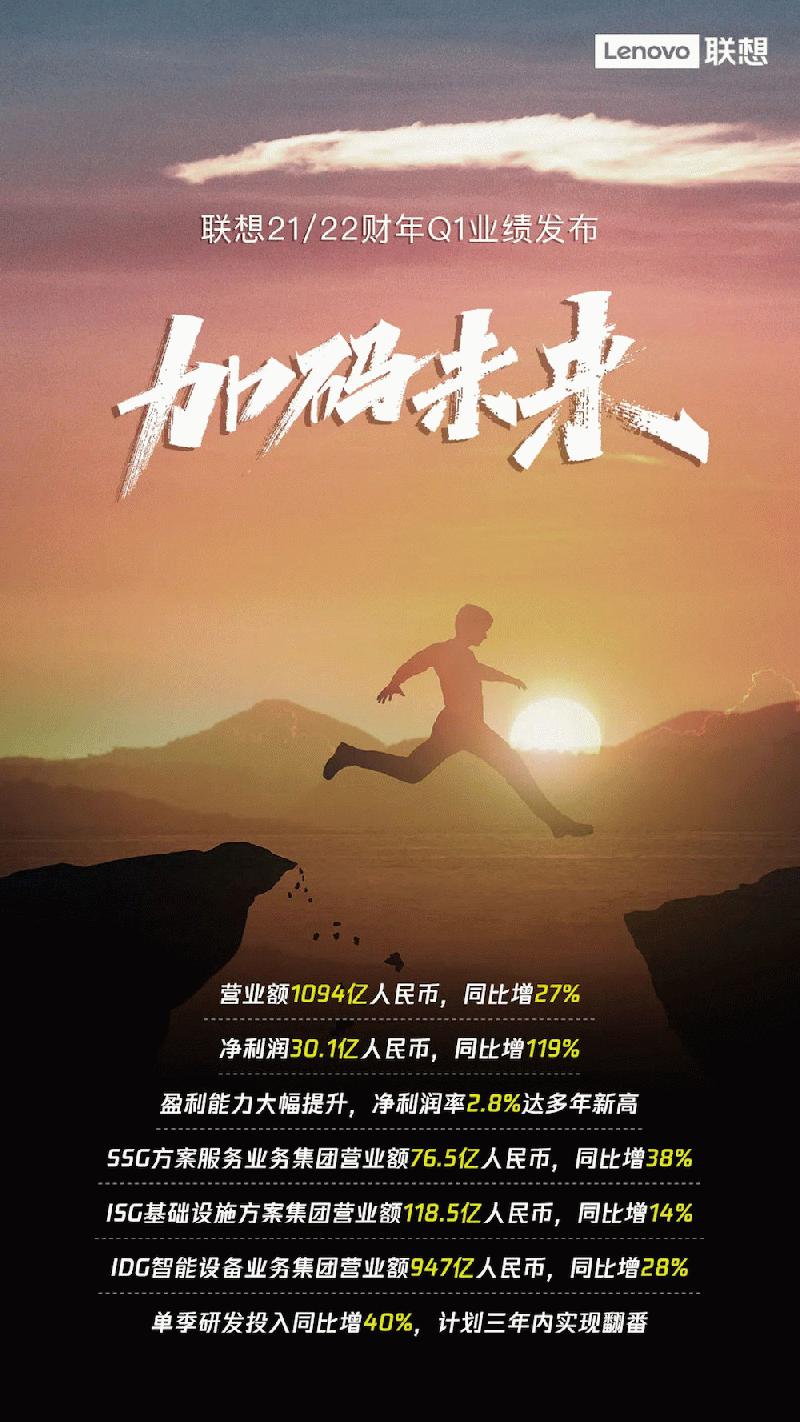 8月11日,中国数字经济领导企业联想集团公布截至2021年6月30日的2021/22财年第一财季业绩:营业额1094亿人民币,同比增长27%。净利润30.1亿人民币,同比增长119%。净利润率2.8%,达到多年以来的新高。联想集团再创史上最强的第一财季业绩。