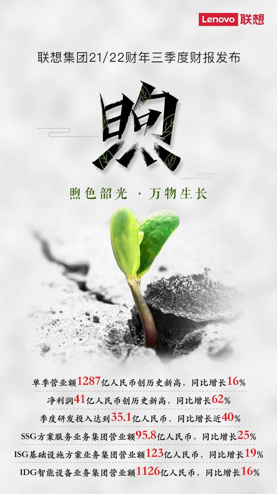 2月23日,中国数字经济领导企业联想集团公布截至2021年12月31日的2021/22财年第三财季业绩:营业额历史性突破200亿美元,同比增长16%至1287亿人民币;净利润40.9亿人民币,同比提升62%,亦创历史新高。