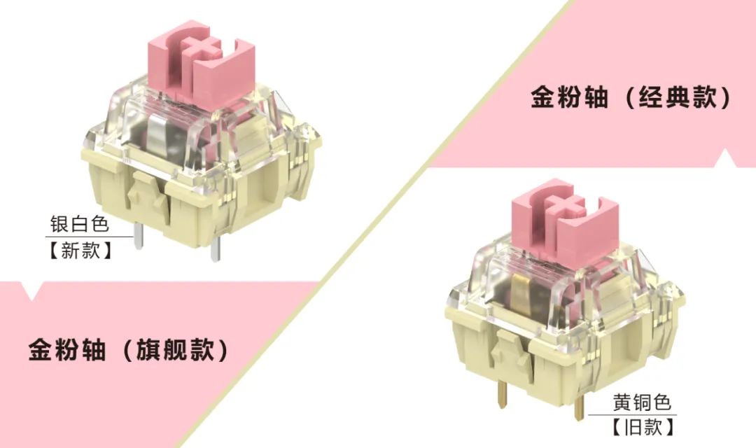 3月7日,TTC金粉轴升级了,在结构和参数不变的条件下,采用了与TTC爱心轴一样的“穿金戴银”工艺,即在端子外表面上增加防氧化涂层镀银工艺,提高轴体抗氧化和耐用性。升级的TTC金粉轴采用长弹簧结构,实现了触压轻柔,回弹有力的清新线性轴体手感,采用TTC双侧壁专利防尘结构轴芯,更稳、防尘、晃动小。