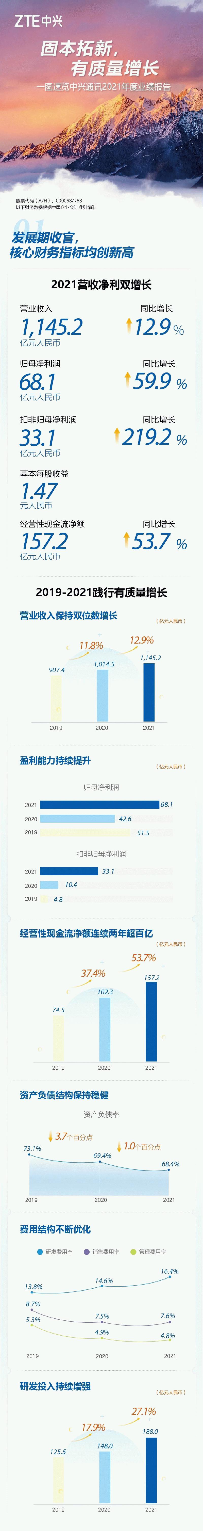 2021年是中兴通讯战略发展期的收官之年。面对新冠疫情以及复杂的外部环境,中兴通讯坚持固本拓新,在夯实核心竞争力的同时,深化数字化转型,持续拓展企业的能力边界和交易边界。在保持各项业务良好增长的同时,经营质量提升显著,营业收入、净利润、经营性现金流净额等核心财务指标均创历史新高。