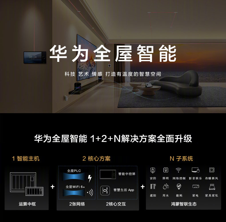 华为推出了全新的成套全屋智能1+2+N解决方案,80㎡的典型户型(2室1厅)价格39999元起。其中包括全屋AI中枢,智能主机SE、智能中控屏等等,让家中环境可以在清晨、中午、傍晚不同环境,AI实现主动预判,实时帮用户调节到适宜的家居环境。在一定程度上,做到了集中控制,自然交互,带来空间交互的革新。配合丰富鸿蒙生态支持,着力增强智慧场景体验,通过高阶场景计算架构,主动给出更适宜的场景推荐。大的AI传感,实现空调风避人、老人智能看护等丰富应用场景;打造一种有温度的智能,能满足不同家用需求。