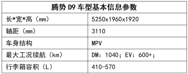 随着时代发展、家庭用车结构变化、汽车消费升级等因素的综合作用,MPV市场高端化、智能化、新能源化的趋势已成大局。腾势D9的推出标志着腾势品牌进入了发展的全新阶段,以更加昂扬的面貌,围绕新豪华、智慧、安全、用户生态四大方面,全力为用户创造超越期待的全优出行生活。