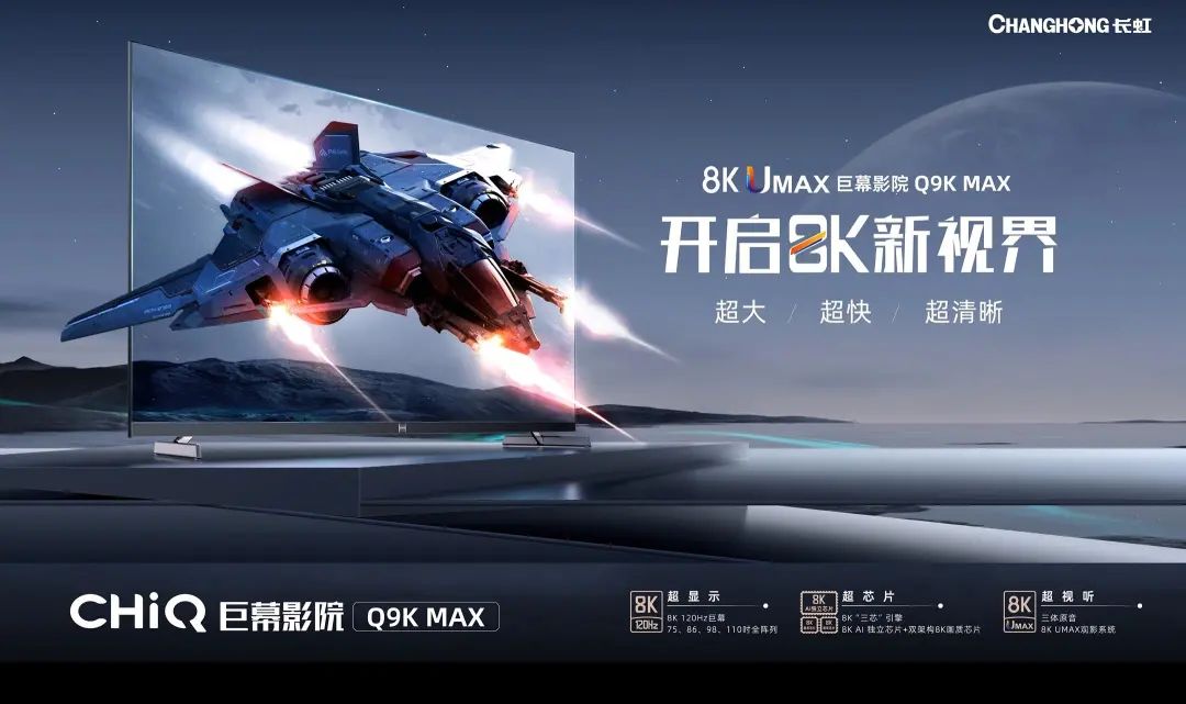 长虹Q9K MAX作为国内率先获得8KA(8K协会)认证的电视,已同时具备8K芯、8K屏、8K内容以及全程8K信号处理,做到120Hz真正的8K电视。“超显示、超视听、超芯片”三重显示黑科技,为用户带来沉浸式和交互式全新体验。8K 120Hz巨幕、旗舰8K“三芯”引擎、UMAX沉浸式观影系统,无论是画质还是音质,都能重新刷新视听感官,带来亲临现场的沉浸式视听体验。