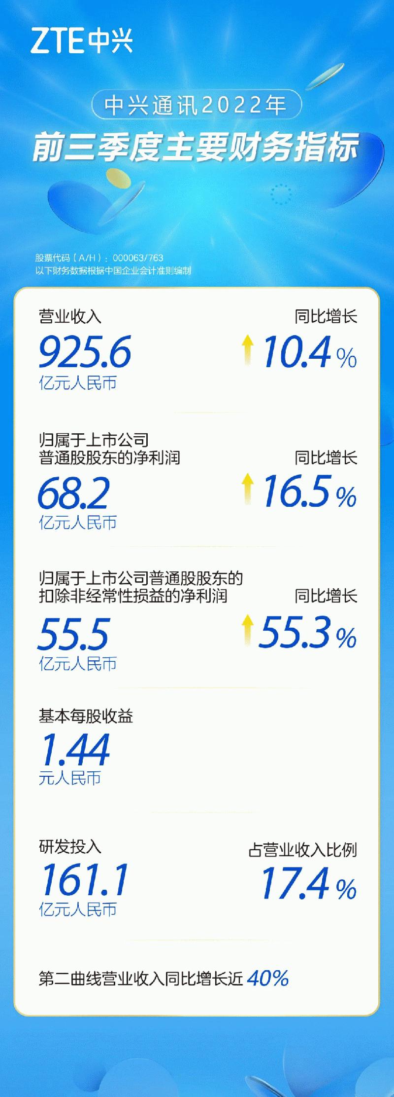 10月26日,中兴通讯发布2022年第三季度报告。2022年1-9月,公司实现营业收入925.6亿元,同比增长10.4%,归属于上市公司普通股股东的净利润68.2亿元,同比增长16.5%;归属于上市公司普通股股东的扣除非经常性损益的净利润55.5亿元,同比增长55.3%;基本每股收益为1.44元。