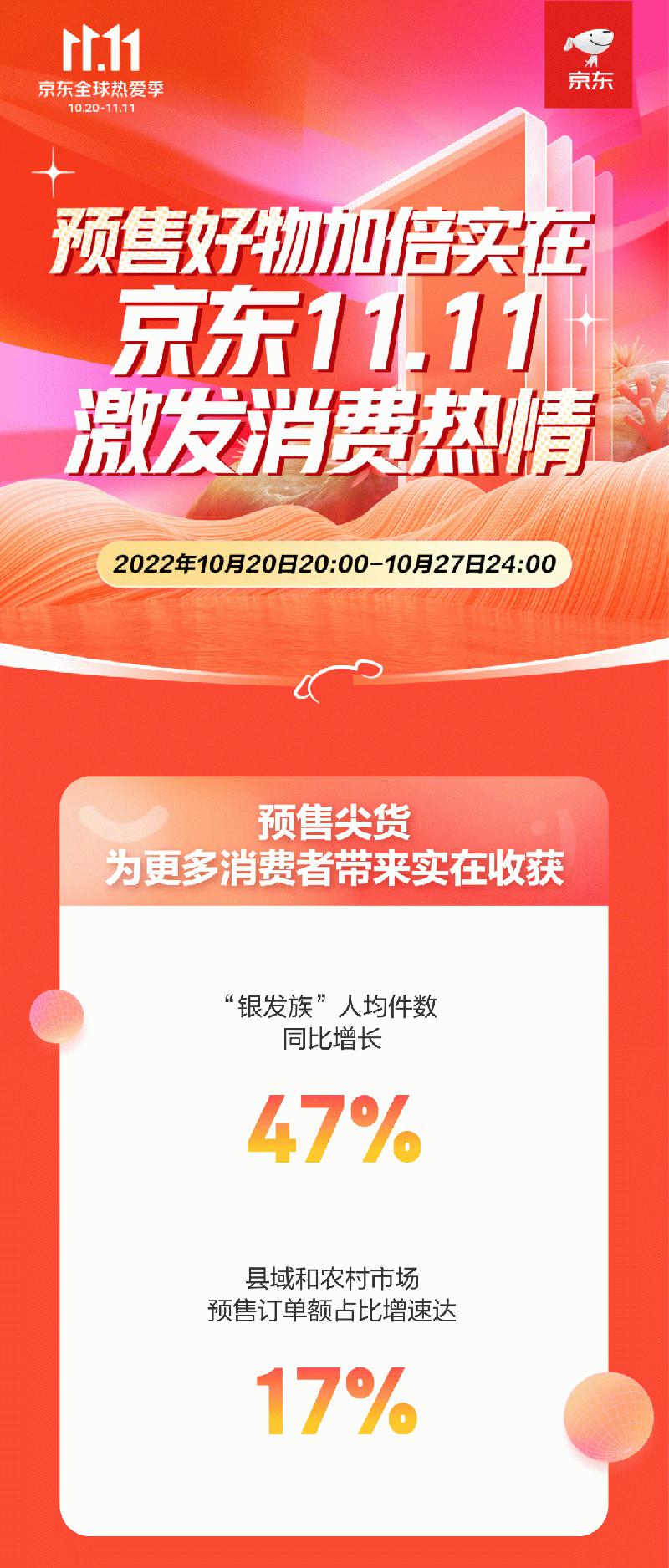 2022年10月20日晚8点,京东11.11预售正式开启。更多消费者有了实实在在的收获,“00后”消费人均件数同比增长19%,“银发族”消费人均件数同比增长47%;下沉市场展现出蓬勃活力,县域和农村市场预售订单额占比增长17% 。实实在在买些“好货”、“尖货”成为大量消费者的追求,仅售99元的荣耀手环6预售订单额同比增长超23倍;以旧换新方式选购新款手机的用户数同比增长超300%;家电“买多件”用户订单量同比增长超60%;修文猕猴桃地标产业带预售期成交额同比增长298%;1000支阿玛尼腕表超低价1折预售上线5分钟内售罄,篮球鞋预售订单金额达去年同期43倍……