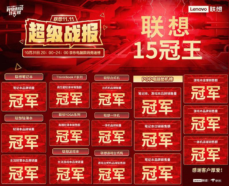 联想双11 2分钟破亿 4小时18亿 15冠王 ......