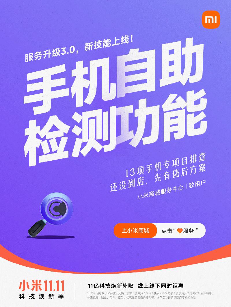 11月8日,小米商城官方宣布,手机自助检测功能正式上线,支持13项手机专项自排查,包括充电、屏幕、系统信息、网络通信、定位导航、传感器等多项检测。如果手机有问题,系统还会为用户推荐距离最近的服务门店,方便用户进行维修。小米用户可先将小米商城更新至最新版本,更新后进入App,点击服务——我的设备——手机自检,即可享受该服务。目前该检测功能仅支持小米、Redmi品牌手机。