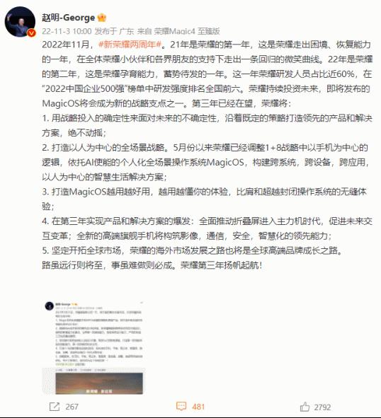 面向充满挑战与未知的新时代,荣耀坚守创新、品质、服务三大战略控制点,持续投资未来,打造出以人为中心,跨应用跨设备的智慧生活解决方案,实现全场景产品生态布局,并在高端战略布局中更进一步。11月22日-23日,荣耀MagicOS暨旗舰新品发布会将正式举行。11月23日,新一代折叠旗舰荣耀Magic Vs系列,以及“全新美学标杆”荣耀80系列也将正式亮相。经过两年的蜕变,荣耀已蓄势待发,将全速向未来扬帆起航。