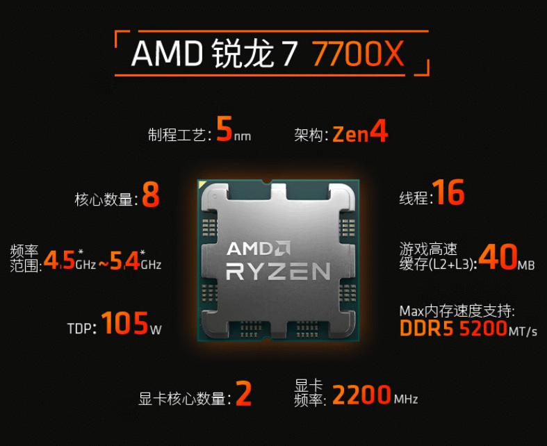 AMD 锐龙7 7700X处理器采用了业界领先的5nm制程工艺的Zen4架构,搭配8核心16线程的配置和最高5.GHz的CPU频率,40MB的高速游戏缓存非常适合电竞玩家,对于预算相对有限但是仍然想要追求高质量整机的朋友来说选购这款CPU搭配其它芯片组产品就可以瞬间将平台升级到AM5了。