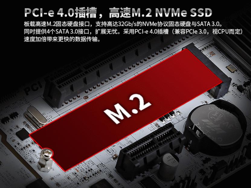 板载全速M.2固态硬盘接口,支持高达32Gb/s的NVMe协议固态硬盘与SATA 3.0。同时提供4个SATA 3.0接口,扩展无忧。采用PCI-e 4.0插槽(兼容PCIe 3.0,视CPU而定),速度加倍,为显卡提供了更快的数据传输。