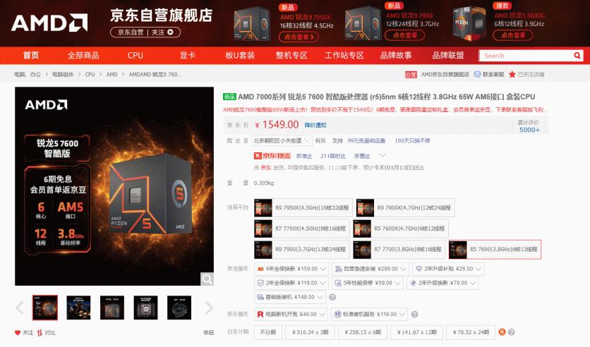 AMD 锐龙5 7600京东购买链接: