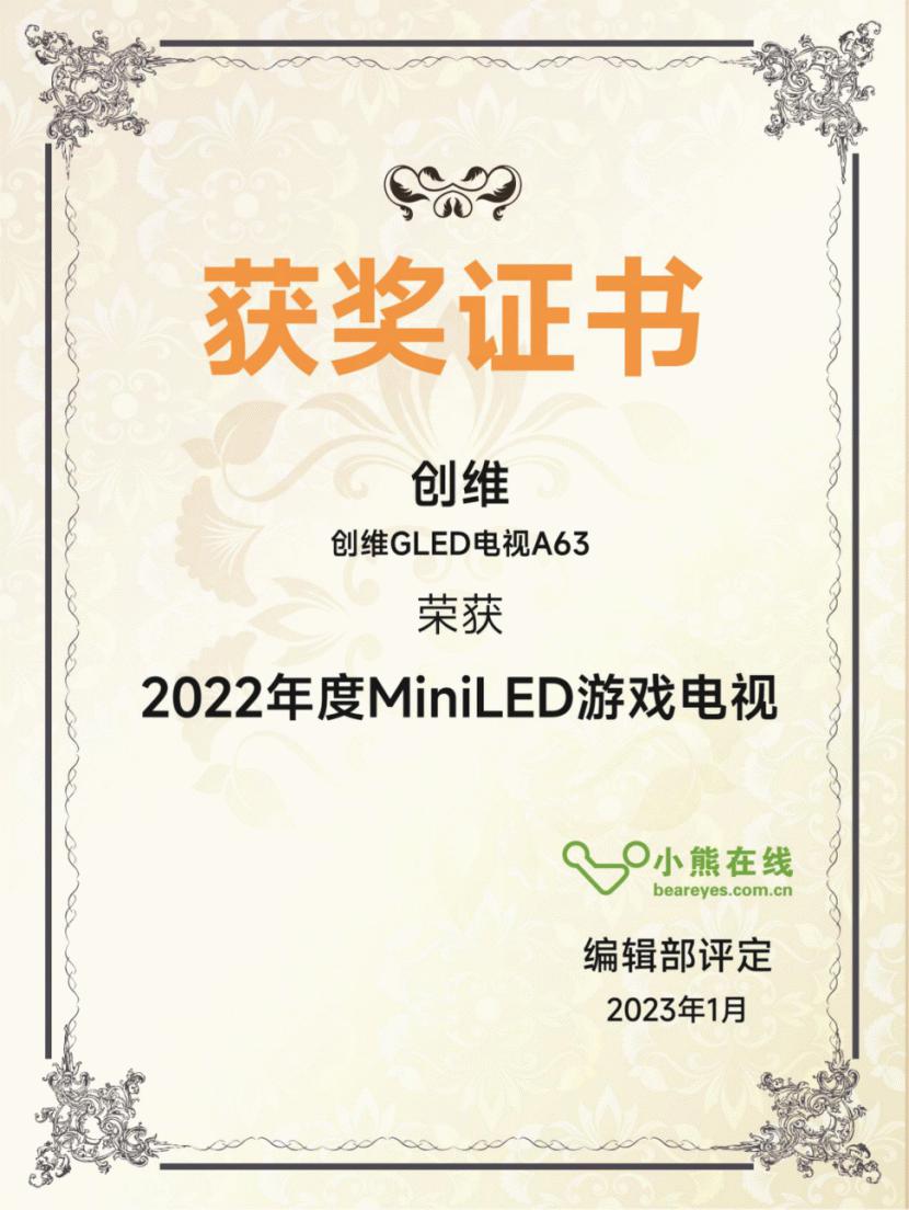 总结:经小熊在线编辑部一致评定授予创维GLED电视A63 为《2022年度MiniLED游戏电视》。