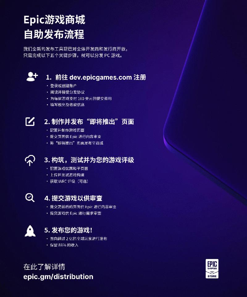 任何开发者与发行商在其游戏符合商城要求的前提下,均可使用这些工具。开发者需要注册一个Epic账号,为每个游戏支付100美元的费用,然后提交游戏并等待审核。对于这些自助上架的游戏,Epic将继续保持12%游戏收入分成,Steamw为30%。如果开发者使用了虚幻引擎,只要使用Epic的支付系统,就能够免除虚幻引擎的分成费用。Epic还将为发行商提供简单且免费的ESRB,PEGI,GRAC,USK以及ASK年龄评级服务,便于游戏迅速在全球各地发布。