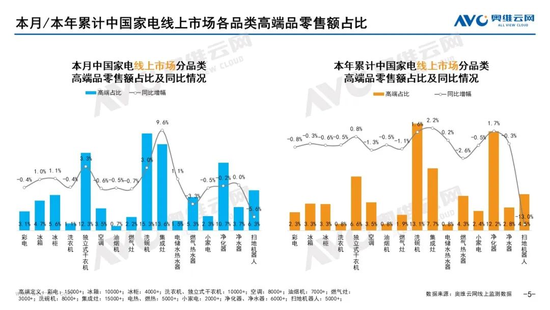 根据奥维云网(AVC)线上市场监测数据显示,本月彩电、白电、厨卫、小家电和环电五大品类的销售情况如下: