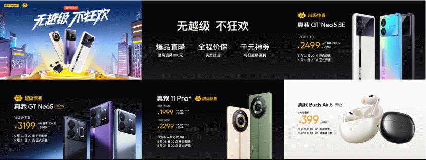 为了迎接618大促,真我GT Neo5系列爆款出击,王牌当道!首先,“可能是行业1TB 机型最丰富的品牌”,以真我GT Neo5系列与真我11Pro系列携手打造第一张“1TB大存储手机王牌”;“3K 档超强闪充王牌”真我GT Neo5至高立减300元,240W 16GB+1TB版到手仅需3199元;“2K 档性能续航王牌”真我GT Neo5 SE至高立减300元,16GB+1TB版到手仅需2499元;“2K 档质感影像王牌”真我 11 Pro+行业首发2 亿新影像,让变焦更自由,也带来百元优惠低至1999元,预售可享6期分期免息!“千元内旗舰耳机王牌”真我 Buds Air 5 Pro上演音质、降噪、体验全面Pro,618惊喜价399元!