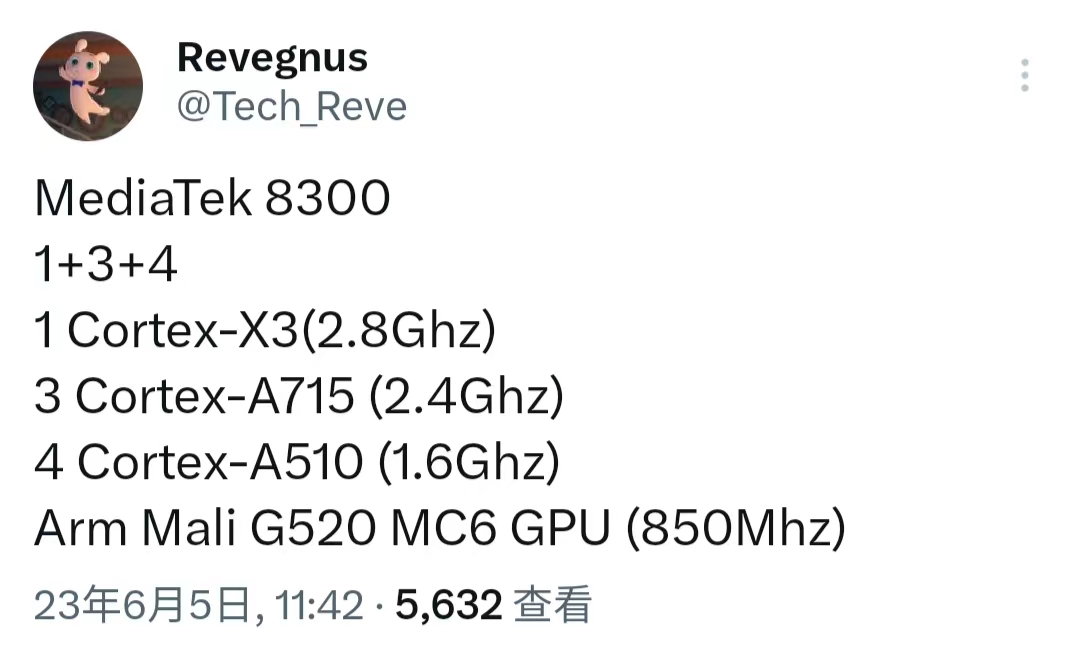 爆料人士 Revengus 在 Twitter 上分享了最新信息,天玑 8300 芯片将采用 1+3+4 架构,采用 2.8GHz 频率的 Cortex X3 内核,以及 3 个 2.4Ghz 频率的 Cortex A714 内核和 4 个 1.6GHz 频率的 Cortex A510 内核,还支持 850MHz 频率的 ARM Mali G52 MC6 GPU。