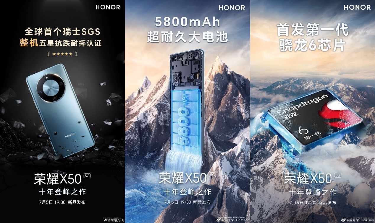 2023年7月14日,荣耀X系列十年登峰之作——荣耀X50全渠道火热开售,首销价1399元起。荣耀X50是全球首个获得瑞士SGS整机五星抗跌耐摔认证的产品,十面抗摔,无惧跌落;1.5K超清护眼硬核曲屏,全心护眼、带来跃级视觉体验;搭载5800mAh超耐久大电池,电池寿命够长,电量久用不衰;首发第一代骁龙6移动平台,4nm先进制程工艺带来强劲性能体验;16GB+512GB超大双存,多任务处理能力、后台APP保活率大幅跃升。