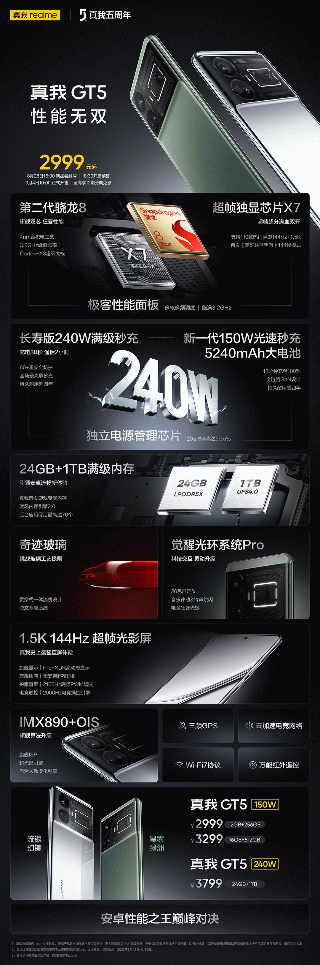 此次发布的真我 GT5 为下一个五年之旅标注了全新起点。作为代表真我「敢越级」理念的旗舰产品,真我GT5是行业唯一一款同时搭载第二代骁龙8以及24GB满级内存和240W满级秒充三大封顶配置的满级旗舰,延续着真我对极致性能的追求,为用户打造「性能无双」的旗舰体验。