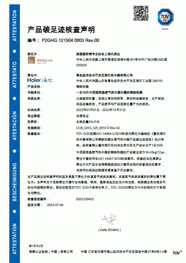 该报告是由国际铜业协会(中国)联合海尔热水器,就重庆海尔热水器有限公司生产的16升水伺服恒温燃气热水器内置核心部件铜换热器进行的产品生命周期碳足迹核查,目前该受核查产品已获得由南德TUV- SUD认证的《产品碳足迹核查声明》,为行业节能减排,做出了新示范。