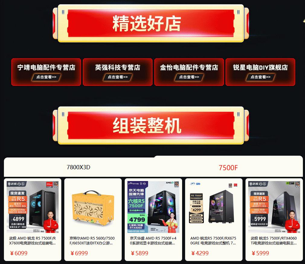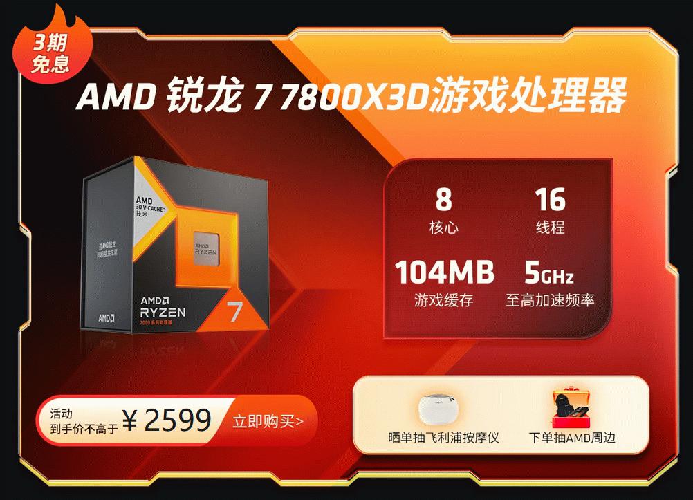 此次活动中的锐龙处理器爆款产品非常多,优先为大家推荐的就是AMD 锐龙7 7800X3D处理器,活动到手不高于2599元;其次是锐龙5 7500F处理器,到手不高于1149元;它们下单直享白条3期免息优惠。这样的报价加上丰富的会员活动内容,综合算下来也已经是近期的超低好价了。