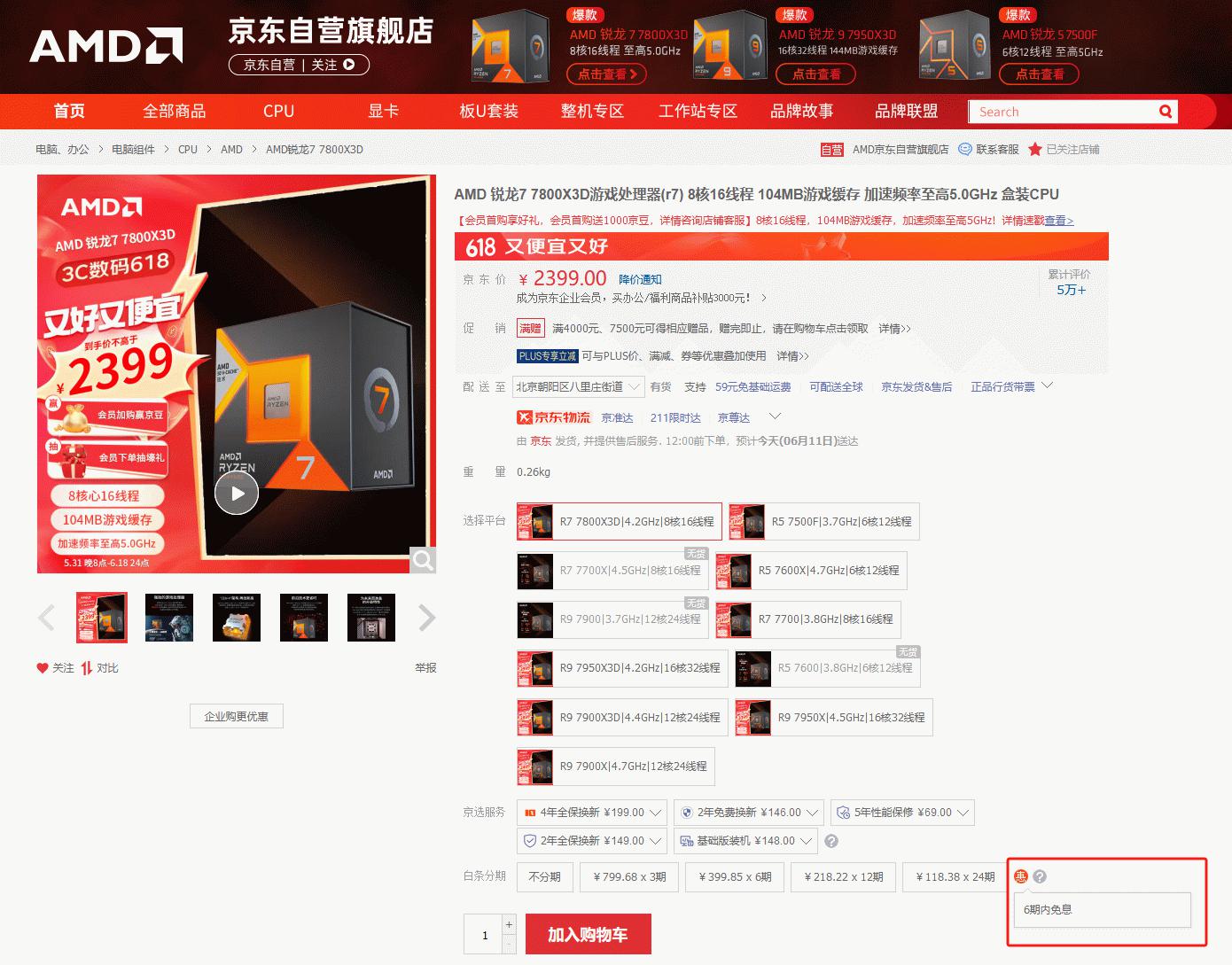 AMD 锐龙7 7800X3D处理器适用于AM5插槽,支持PCIe 5.0和DDR5内存,让DIY玩家们直接进入AM5时代,AMD承诺这一代至少可以用到2025年以后,大家可以放心“战未来”。目前AMD 锐龙7 7800X3D处理器在京东自营旗舰店的到手价不高于2399元,同时享受白条分6期免息的活动,还能参与晒单返E卡和以旧换新拿补贴等活动,真的是入手的最佳时机。当然对AMD其它硬件产品感兴趣的朋友也可以前往618活动的主会场去选购其它心仪的产品,一定可以让您满载而归。