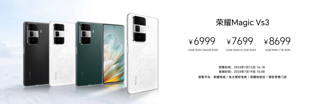 荣耀Magic V3共推出丝路敦煌、苔原绿、祁连雪、绒黑色四款潮流配色12GB RAM+256GB ROM、16GB RAM+512GB ROM、16GB RAM+1TB ROM三个配置版本,售价分别为8999元、9999元、10999元。荣耀Magic Vs3共推出祁连雪、苔原绿、绒黑色三款潮流配色,12GB RAM+256GB ROM、12GB RAM+512GB ROM、16GB RAM+1TB ROM三个配置版本,售价分别为6999元、7699元、8699元。荣耀Magic V3、荣耀Magic Vs3将于7月12日16:18开启预售,7月19日10:08在荣耀商城、各大授权电商、荣耀体验店、授权零售门店同步开启首销。