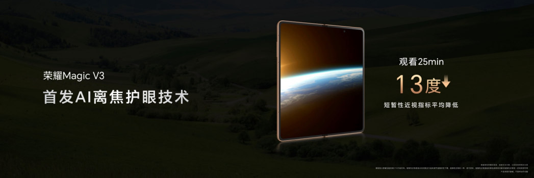 在健康显示领域,荣耀率先深耕探索。2023年荣耀第一代绿洲护眼屏正式发布,开启手机护眼先河,引领智能终端护眼赛道。为了进一步解决手机屏幕与护眼矛盾的行业难题,荣耀联合北京同仁医院,以端侧AI赋能绿洲护眼屏全面升维。行业首发视力舒缓绿洲护眼屏,模拟离焦镜效果首发AI离焦护眼技术,观看屏幕25分钟可促进脉络膜增厚,让眼部更舒缓,实现智能手机领域护眼技术的革命性创新。另一方面,荣耀经过深入洞察消费者需求,联合复旦大学附属医院眼耳鼻喉科干眼中心,首发干眼友好绿洲护眼技术,在AI底层技术加持下识别干眼风险、主动显示调节,有效解决用眼干涩痛点。荣耀以屏幕技术为底座,以人因体验为目标,开启AI时代下电子终端护眼时代。