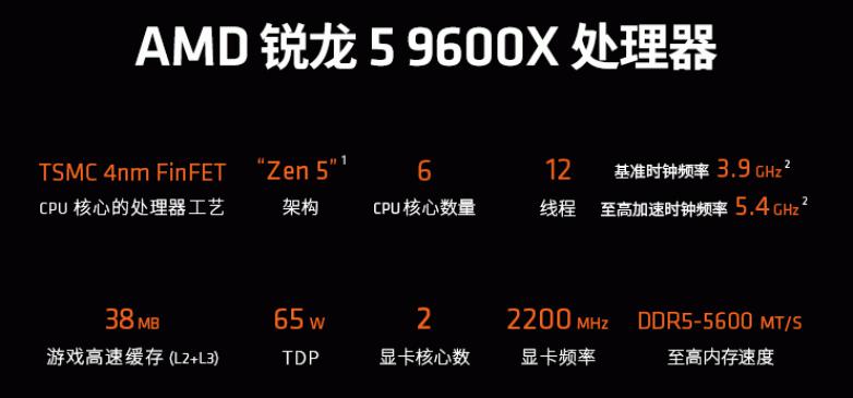 AMD 锐龙5 9600X处理器采用了TSMC 4nm FinFET工艺制程的ZEN5架构,搭配6核心12线程的配置和高达5.4GHz的最高频率,总计38MB的游戏缓存和65W的功耗设计适合各类入门级玩家使用。