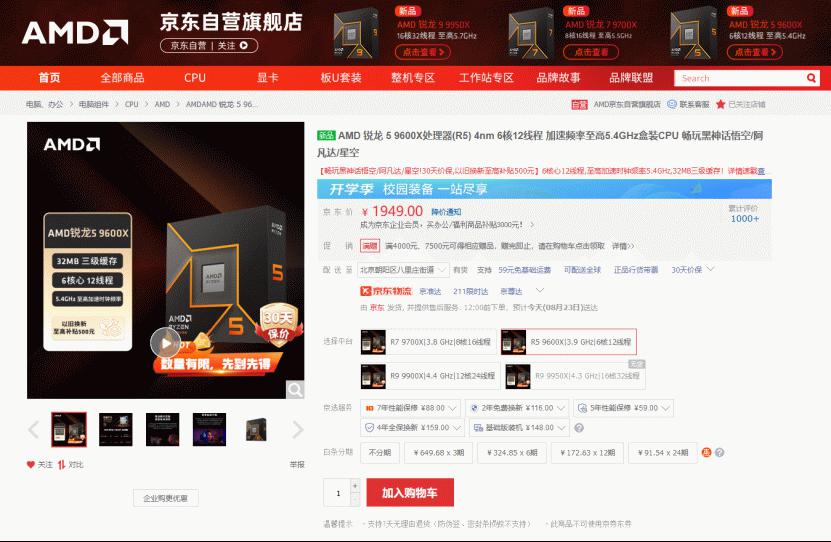 目前AMD 锐龙5 9600X处理器在京东自营旗舰店的首发报价是1949元,在经历了首批产品被一抢而空之后,AMD积极补上了库存,目前大家可以现货购买到了。现在新品首发期有晒单返京东E卡的主要活动,同时可参与白条6期免息和以旧换新享至高500元补贴,而30天京东价保让大家无惧降价,成为京东旗舰店会员还有首购返京豆和多重会员福利可享。
