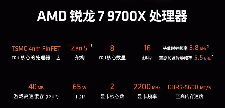 AMD 锐龙7 9700X处理器是锐龙9000系列处理器中最符合主流游戏玩家的一款产品,它不仅可以胜任《黑神话:悟空》这样的3A大作,也能通杀目前国内流行的竞技网游。而且AMD 锐龙9000系列处理器适用于AM5插槽,支持PCIe 5.0和DDR5内存,玩家们直接就进入了AM5时代,AMD最新承诺这一代至少可以用到2027年+,后续更多游戏大作面世,大家有提升性能需求的话,只要购买新的处理器即可,让大家放心“战未来”!