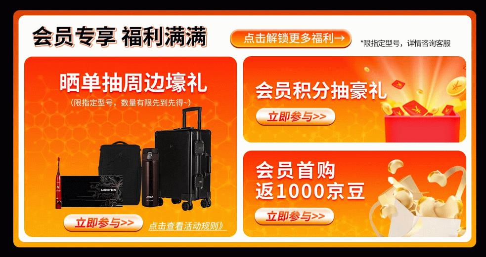 首先建议朋友们成为AMD京东自营旗舰店的会员,加入会员之后就可以解锁一系列的福利了,新会员首购返1000京豆,会员积分还能抽豪礼。而所有购买了指定型号产品的用户还能参与晒单抽周边壕礼的活动。