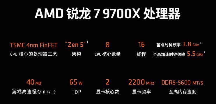 首先是近期市场的爆款产品-AMD 锐龙7 9700X处理器,它采用了TSMC 4nm FinFET工艺制程的ZEN5架构,搭配8核心16线程的配置和高达5.5GHz的最高频率,总计40MB的游戏缓存和65W的功耗设计非常适合主流玩家使用。面对各类3A大作,它可以让玩家们稳定爽玩,毫无后顾之忧。
