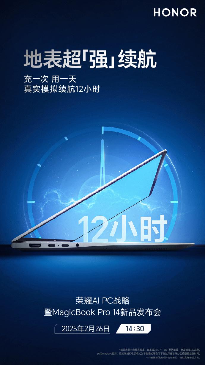 据了解,荣耀MagicBook Pro 14除了拥有超长续航外,性能释放也达到80W的超强表现。HONOR Turbo X还有哪些新的调校魔法,2月26日新品发布会敬请期待。
